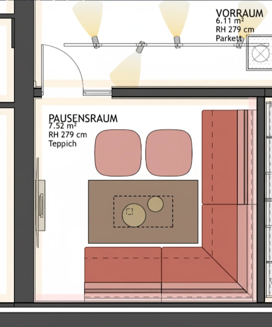 In order to have as many seats as possible in this small room, the bench was made to measure. The seat and backrest upholstery are individually designed and covered with different fabrics – perfectly coordinated in terms of color.